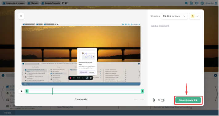 O vídeo gravado será salvo no Workspace JAM apos clicar em “Create e copy link” para edição ou compartilhamento.
