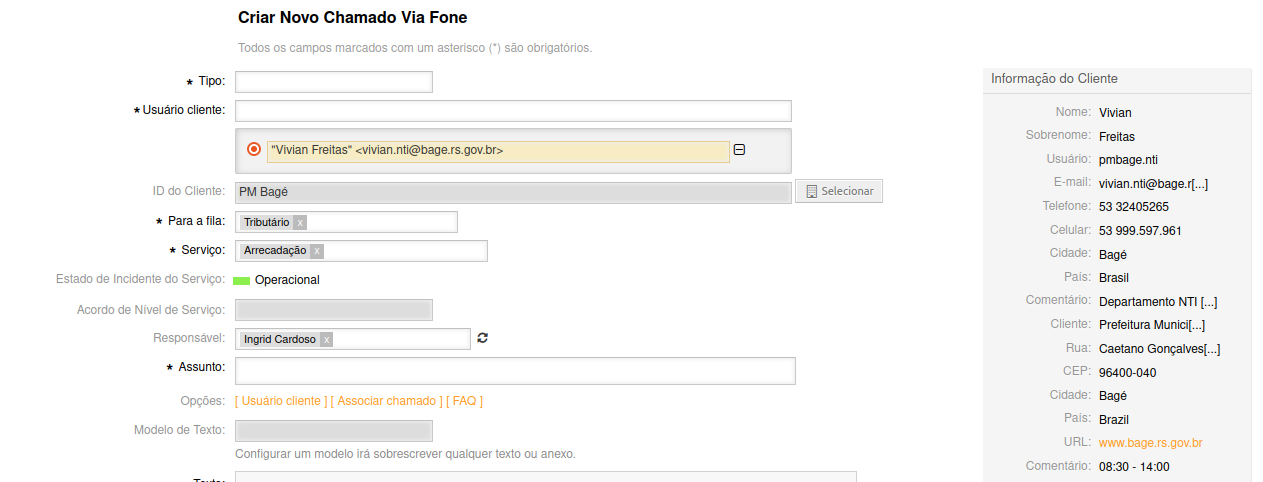 CHAMADOS > NOVO CHAMADO VIA FONE OU VIA EMAIL