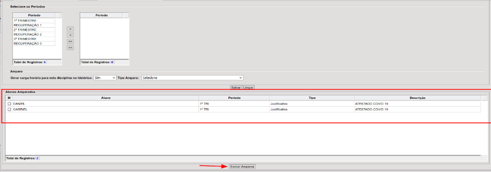 Esta funcionalidade permitirá o registro dos amparos dos alunos que por algum motivo, não terão suas avaliações registradas como exemplo, um aluno afastado por licença médica, caso o mesmo fique impossibilitado de realizar qualquer tipo de avaliação, o sistema permitirá que ele seja amparado no período de avaliação em que o mesmo não terá avaliação.