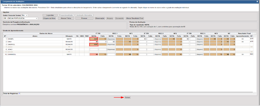 Basta fechar esta tela, e após o sistema redirecionar para a tela principal e constará no campo NOTA, o amparo do aluno . Clique no botão [Salvar].