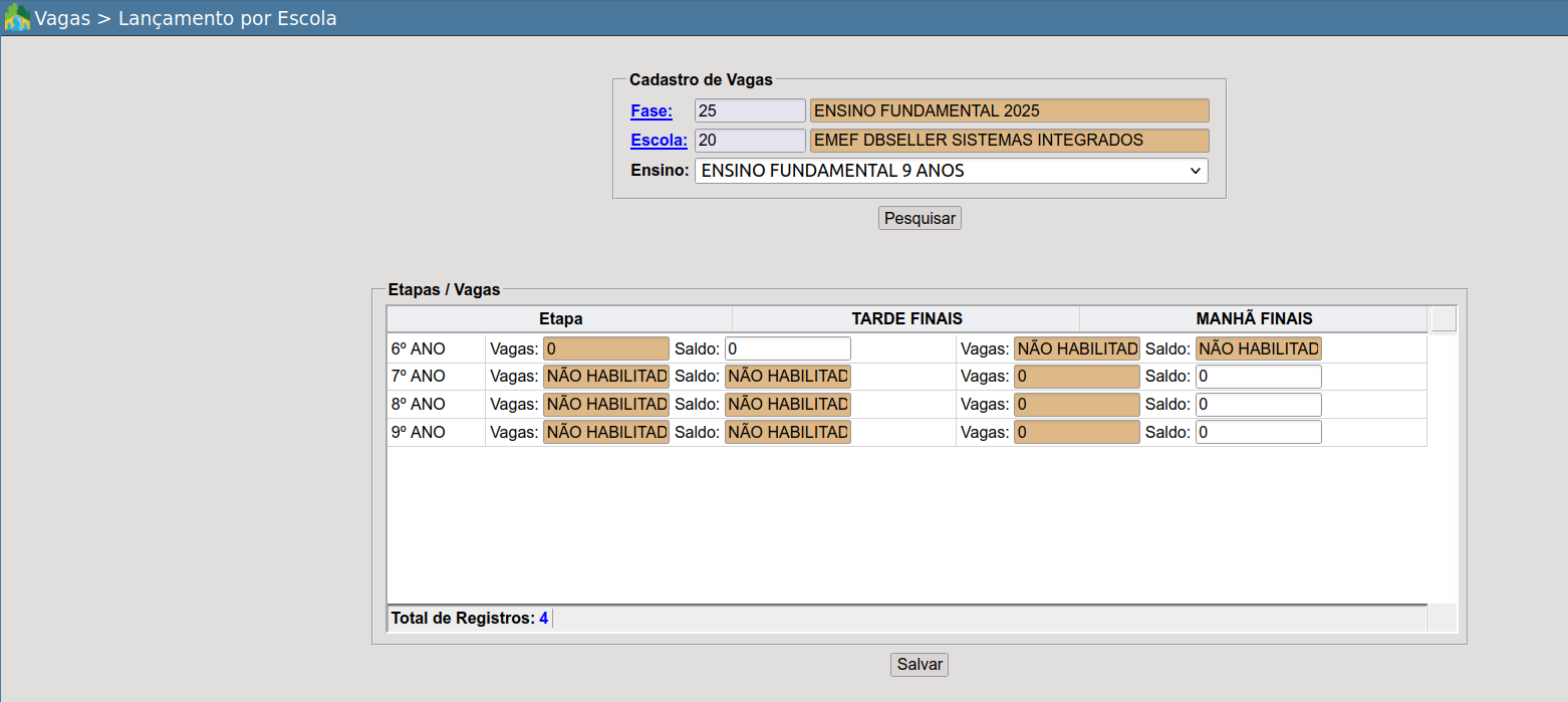 Lançamento por escola: cadastrar as vagas diretamente na rotina por escola, ensino, etapa e turno.