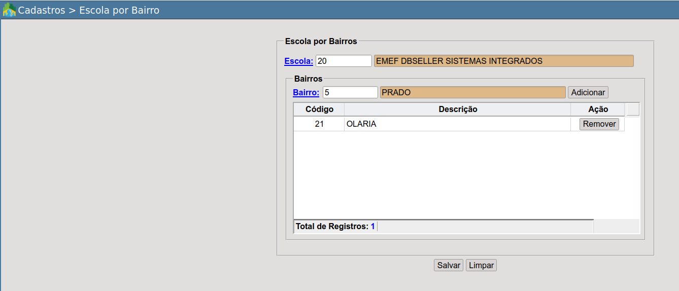 Através deste item de menu é possível realizar a inserção dos bairros atendidos por cada escola.
