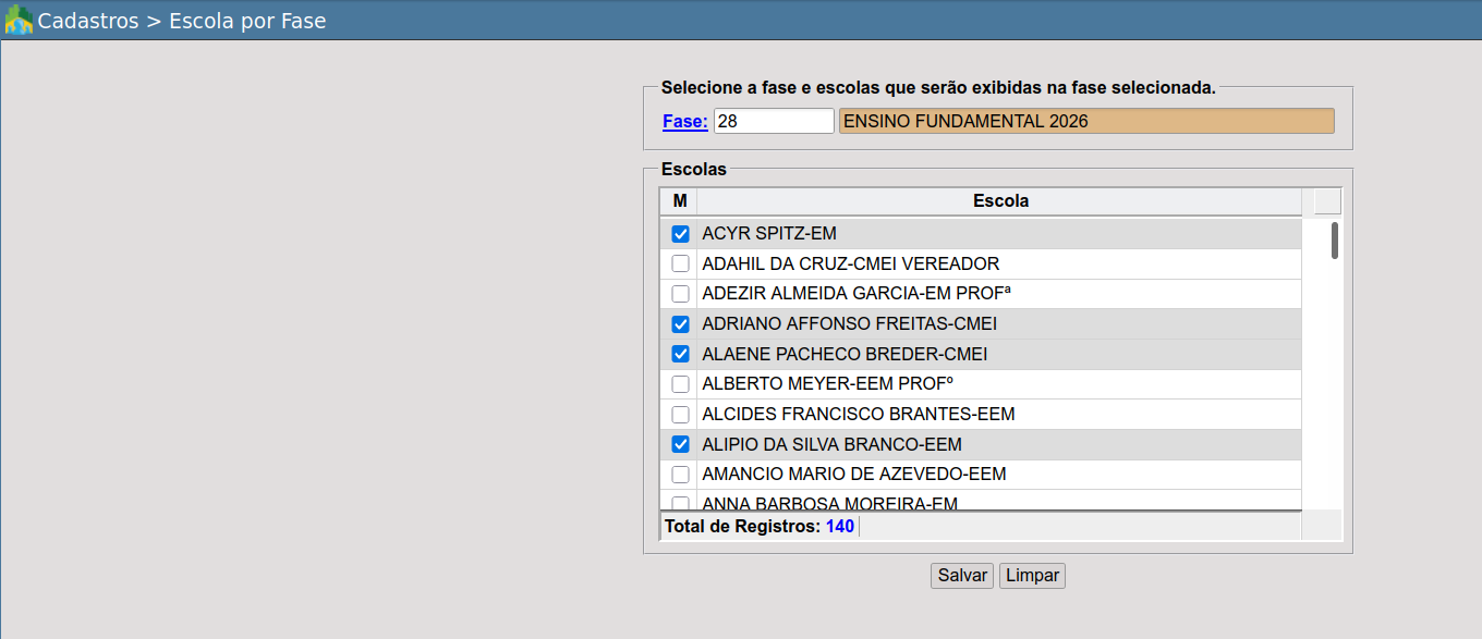 Após selecionar todas as escolas disponíveis para a fase indicada, clique em Salvar.