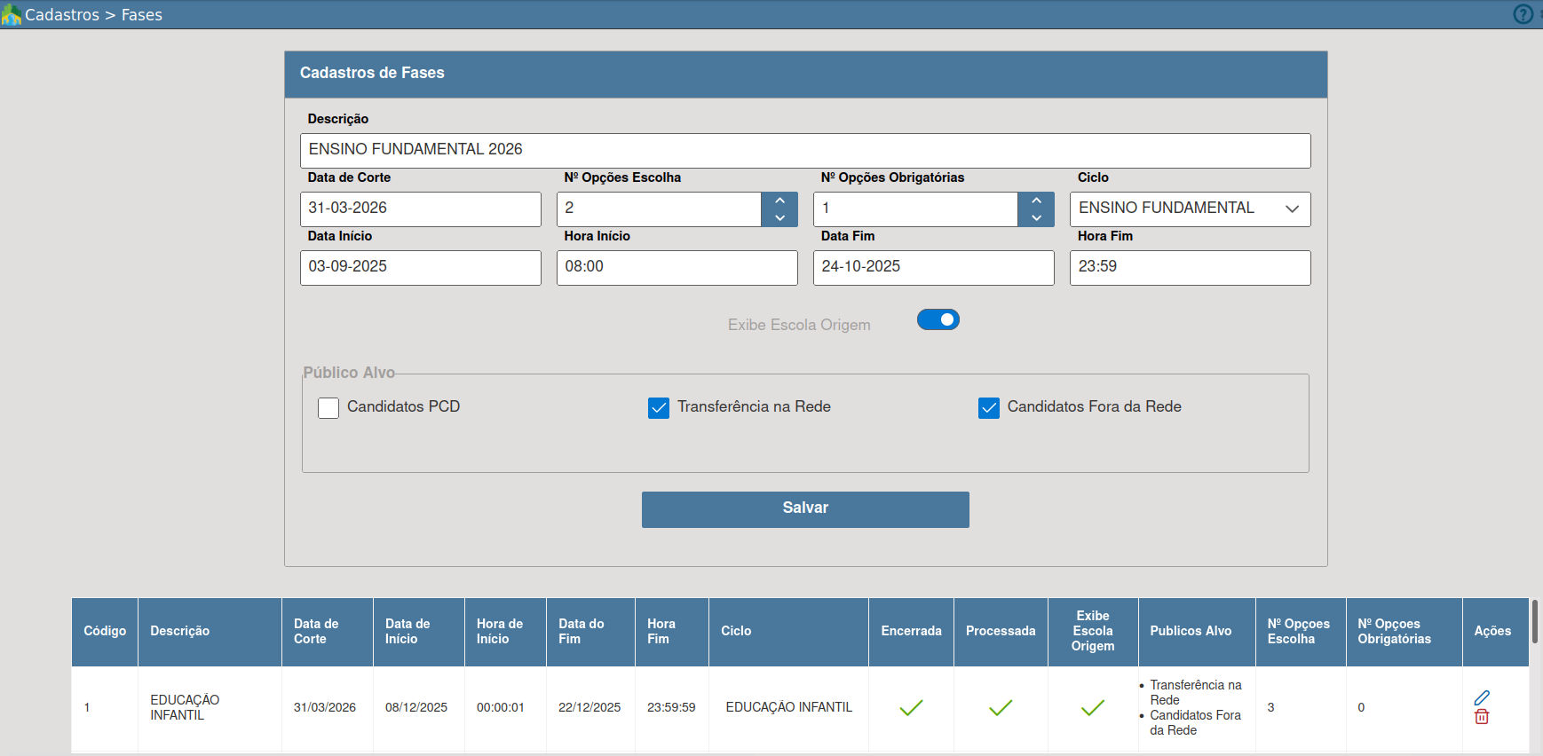 Com base nas idades configuradas neste cadastro, o sistema irá indicar, no portal, a etapa correta compatível com a data de nascimento do aluno, considerando a data de corte configurada na fase.