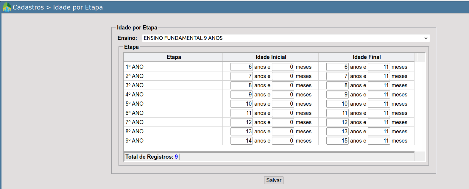 Através deste item de menu, é possível definir a idade inicial de cada etapa e a idade final correspondente a cada ensino.