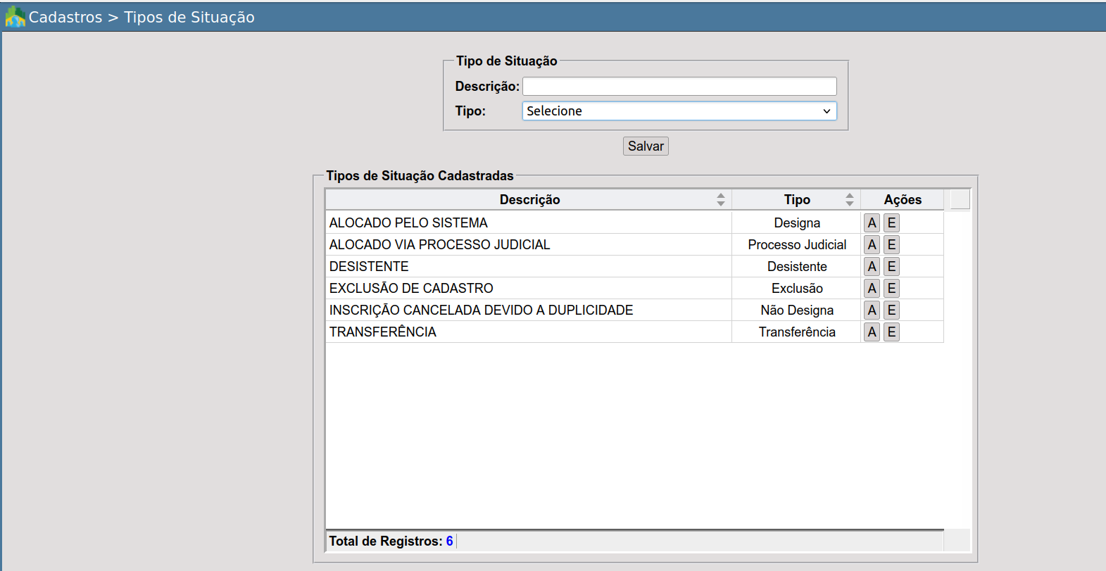 Conforme a descrição , selecione o tipo de situação que será vinculada ao cadastro. O sistema listará as seguintes opções: