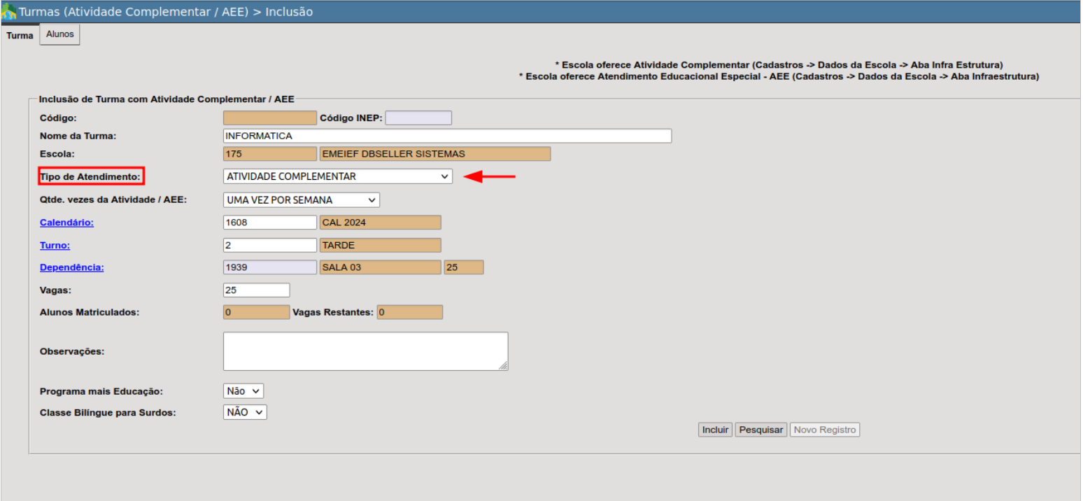 Nesta rotina serão cadastradas as turmas de atividade complementar e turmas de Atendimento educacional Especializado. Composta por alunos de várias etapas, sendo que poderão ser vinculados tanto alunos da rede municipal de ensino como alunos de fora da rede.