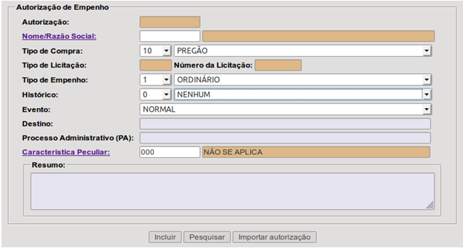 Normalmente a autorização de empenho é gerada no Departamento de Compras. Em um caso prático, o DTI por exemplo, desejando iniciar o processo para aquisição de um computador, deve: