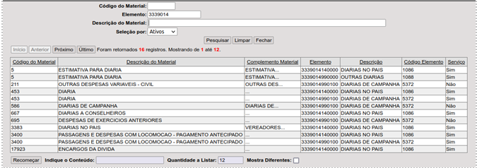 - pela descrição do material, selecionando entre os itens ativos ou inativos clicando em seguida no botão pesquisar.