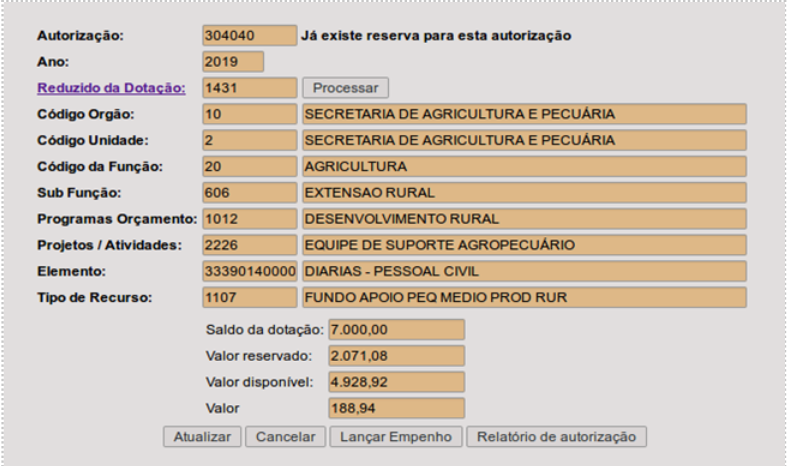 Importante: somente aparecerão dotações as quais: