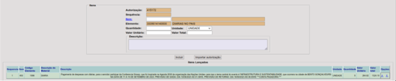 Após clicar na linha desejada o sistema irá retornar à tela anterior em que deverão ser digitadas a quantidade, o valor unitário, o valor total será calculado automaticamente pelo sistema, a descrição se necessário, em seguida clicar no botão incluir e observar se na tela ITENS LANÇADOS estão demonstradas todas as opções selecionadas: