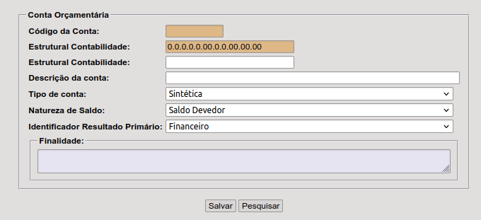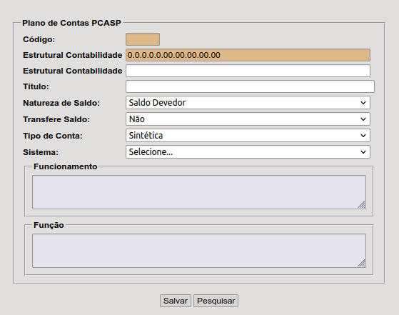 Tela inicial do cadastro de contas PCASP