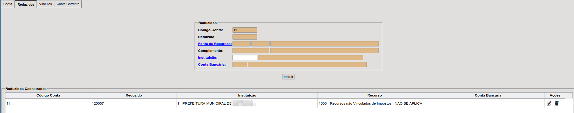 Se a conta for analítica, irá abrir a aba Reduzidos, onde apenas terá de informar a Instituição correspondente e o recurso da conta.