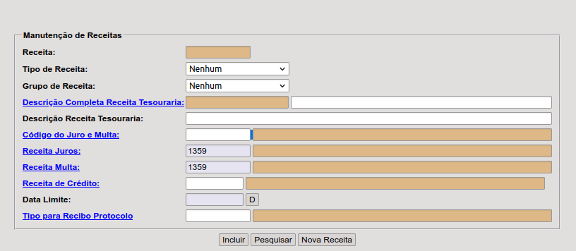 TESOURARIA > CADASTROS > MANUTENÇÃO DE RECEITAS > INCLUSÃO