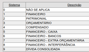 Sistema: Não se aplica, Orçamentária, Patrimonial, Controle