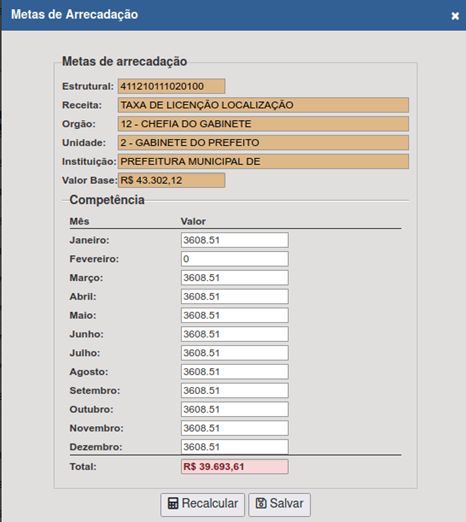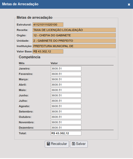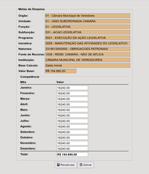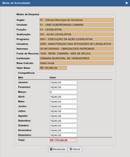 O sistema já irá trazer os valores alocados aos 12 meses, podendo recalcular, escolhendo colocar todo o valor em um único mês, por exemplo.