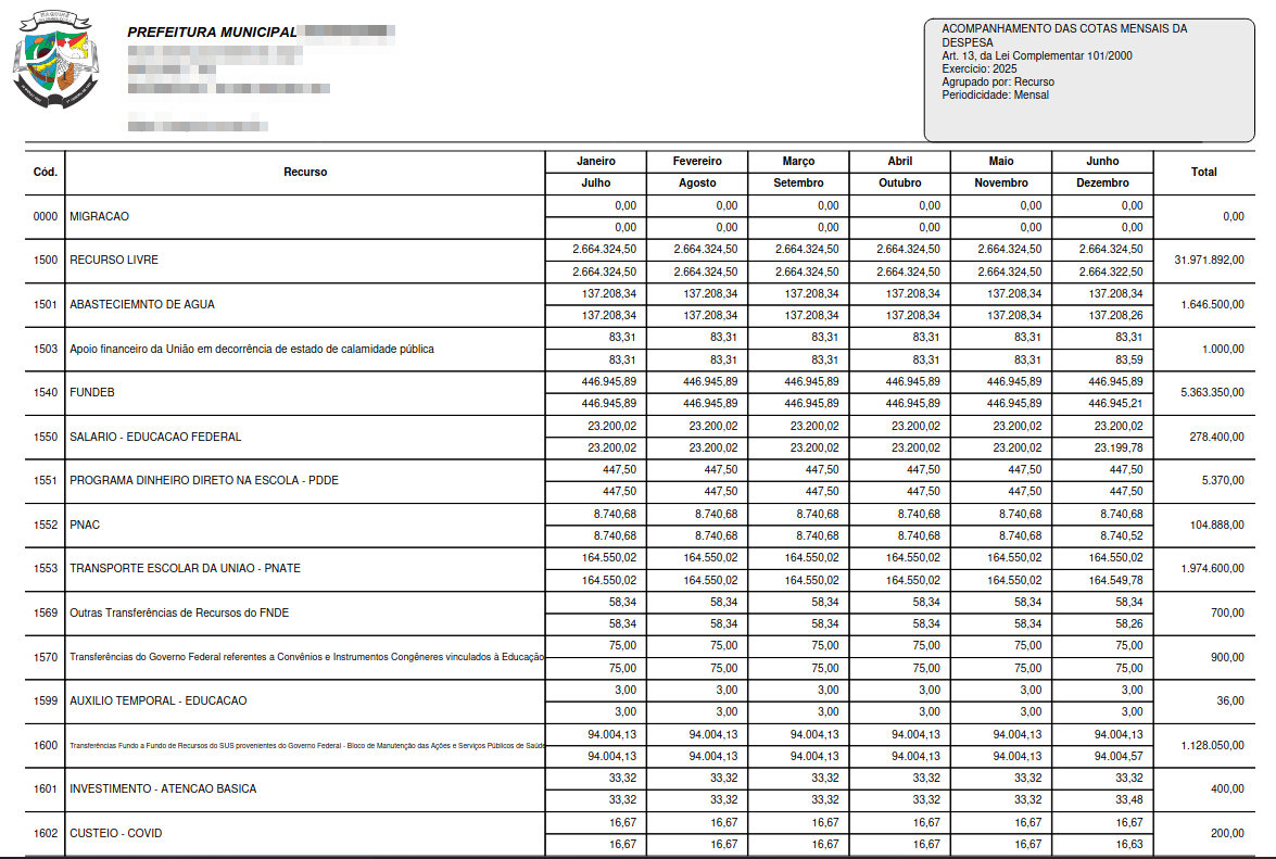 FINANCEIRO > Orçamento > Relatórios > Acompanhamento do Cronograma > Cotas Mensais da Despesa