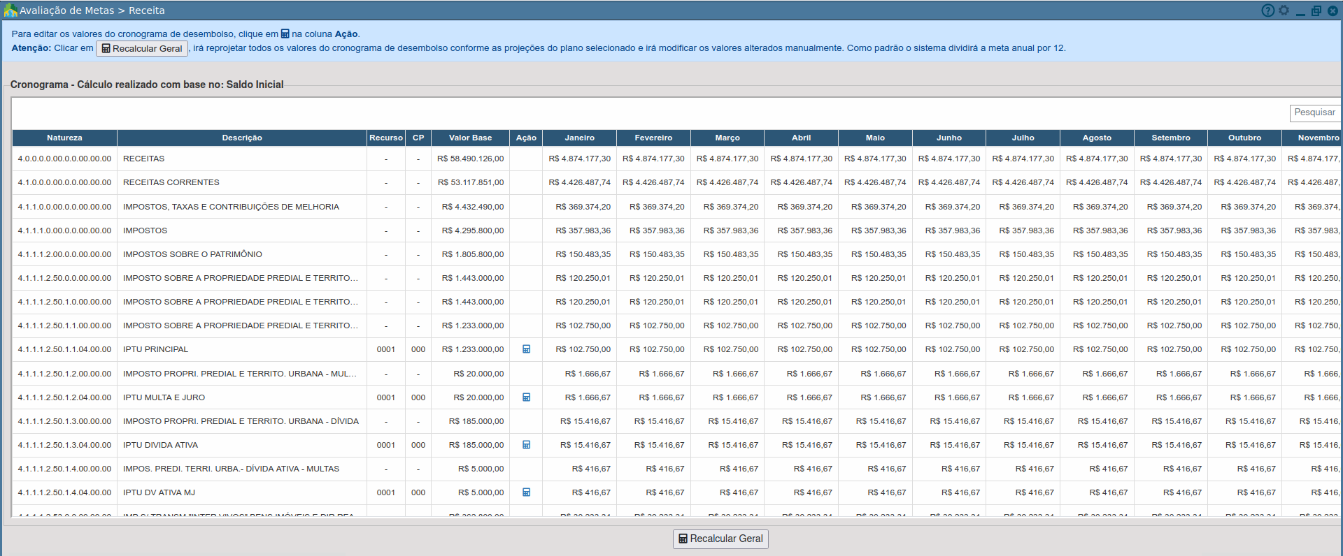 Atenção: Clicar em Recalcular Geral, irá reprojetar todos os valores do cronograma de desembolso conforme a base de cálculo selecionada e irá modificar os valores alterados manualmente. Como padrão o sistema dividirá a Base de cálculo por 12.