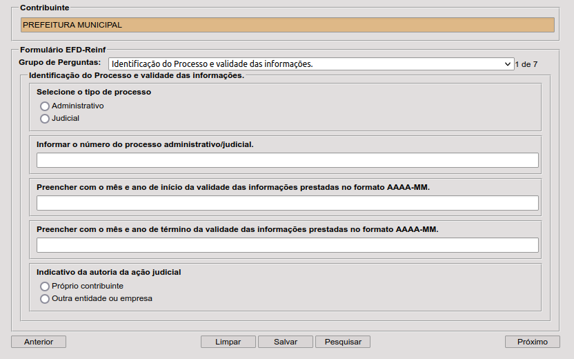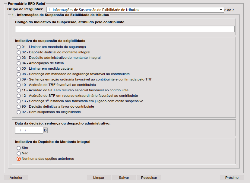 - Selecione o “Grupo de Perguntas”: 1- Informação de suspensão de exigibilidade de tributos