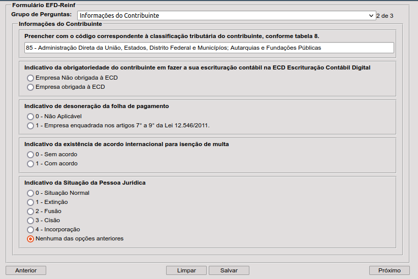 Selecione o “Grupo de Perguntas”: “Informações do Contribuinte”;