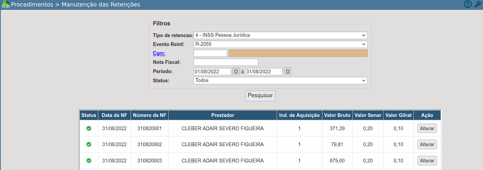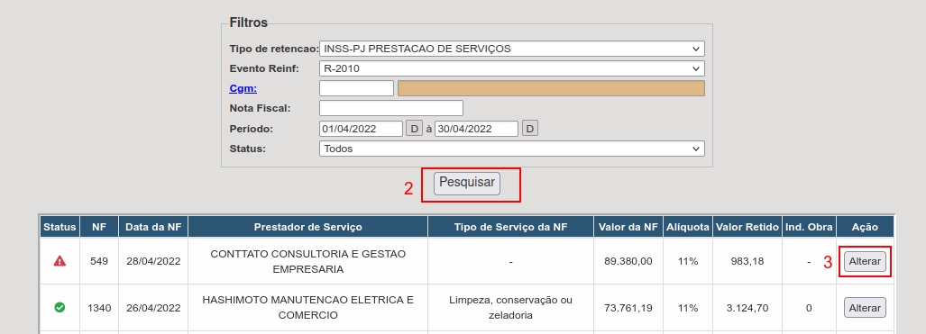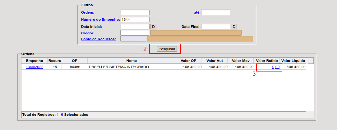 2. Utilize as opções do filtro para buscar as retenções e clique em Pesquisar;