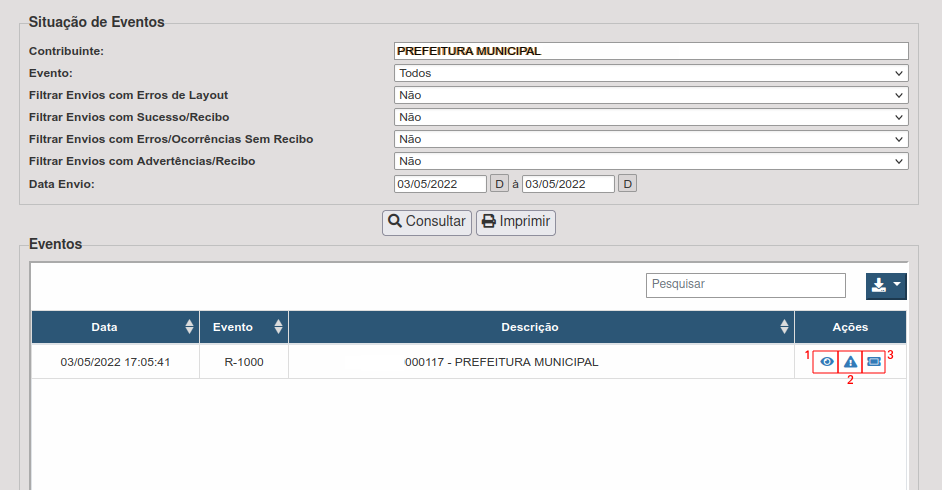 Ao realizar a consulta o resultado irá demonstrar três ações em forma de ícones conforme imagem abaixo. São eles: