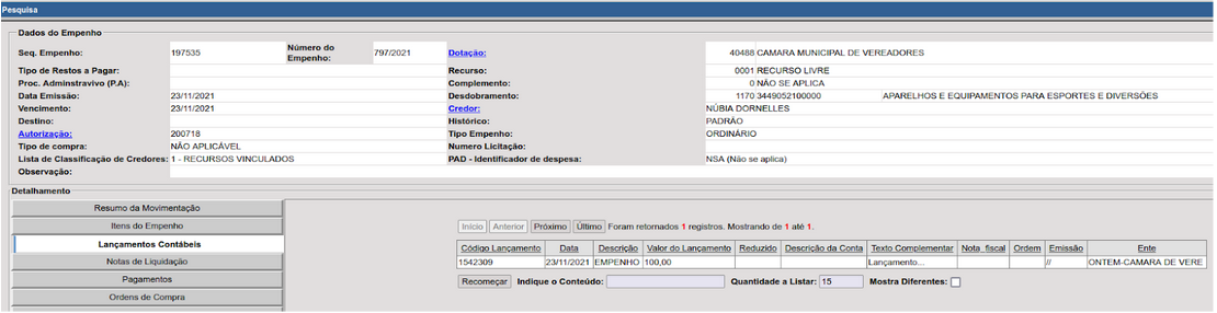 Consulta do empenho ao realizar a entrada da ordem de compra: