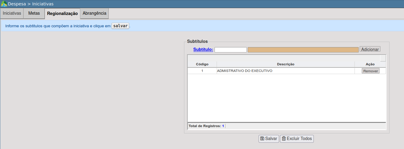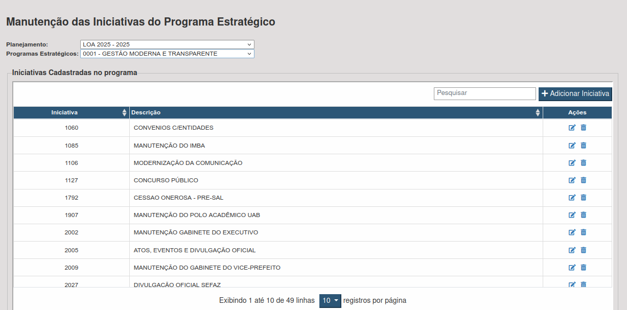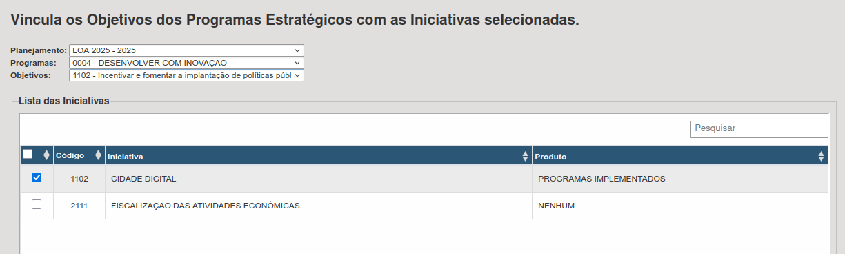 Selecionar o Planejamento, o Programa e a Iniciativa cadastrados anteriormente e clicar em