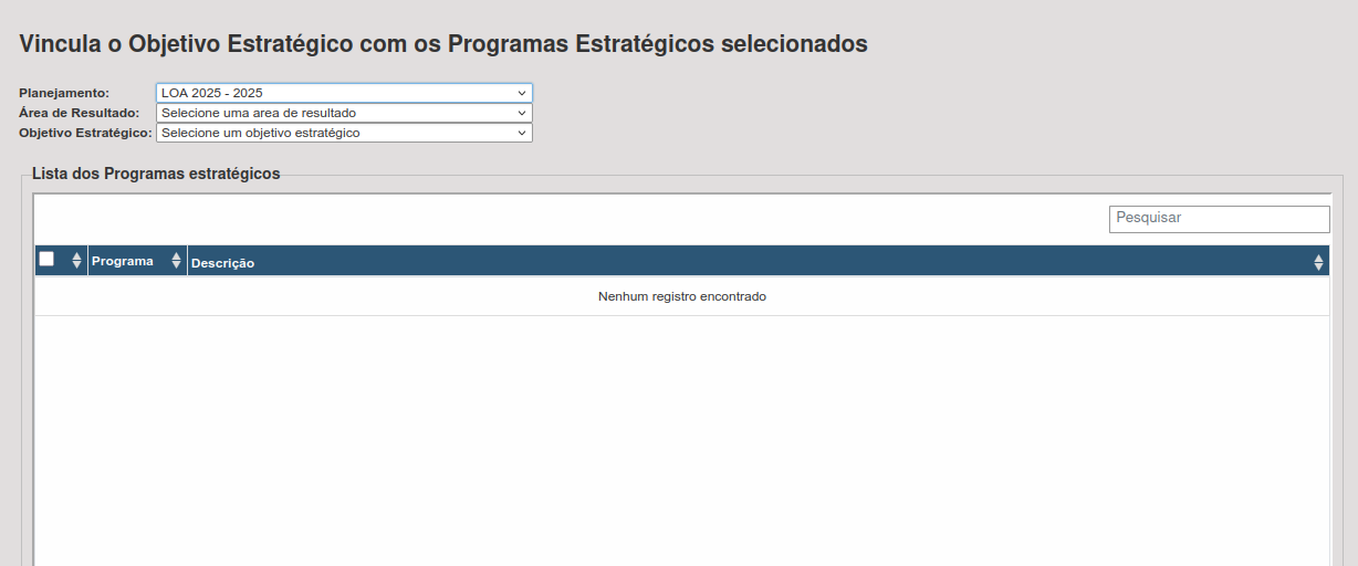 Quando se configura o Planejamento para ter objetivo estratégico dentro da Área de Resultado, não temos o vínculo do mesmo com os Programas Estratégicos.