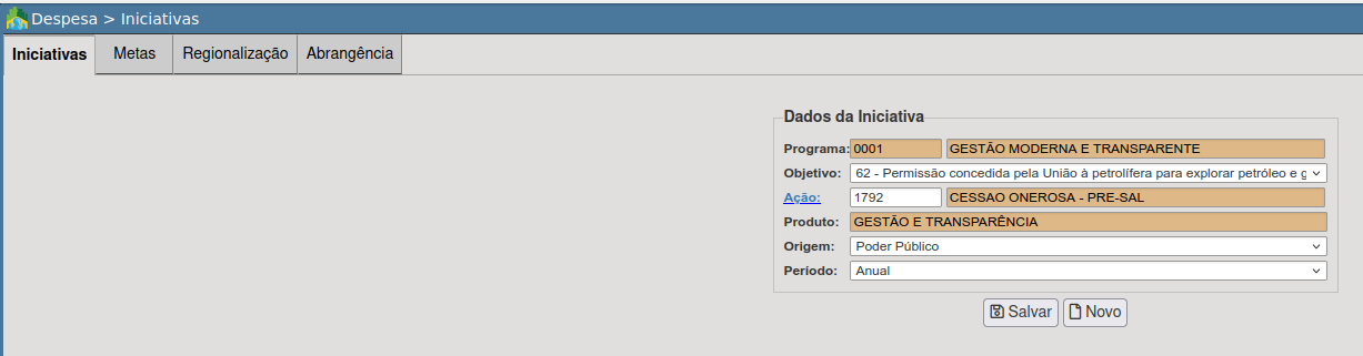 Se ao selecionar o Programa, não aparecer nenhuma iniciativa, provavelmente ainda não tenha sido vinculada nenhuma ao programa selecionado. Volte para o cadastro de iniciativas e busque o programa em questão para alimentá-lo: