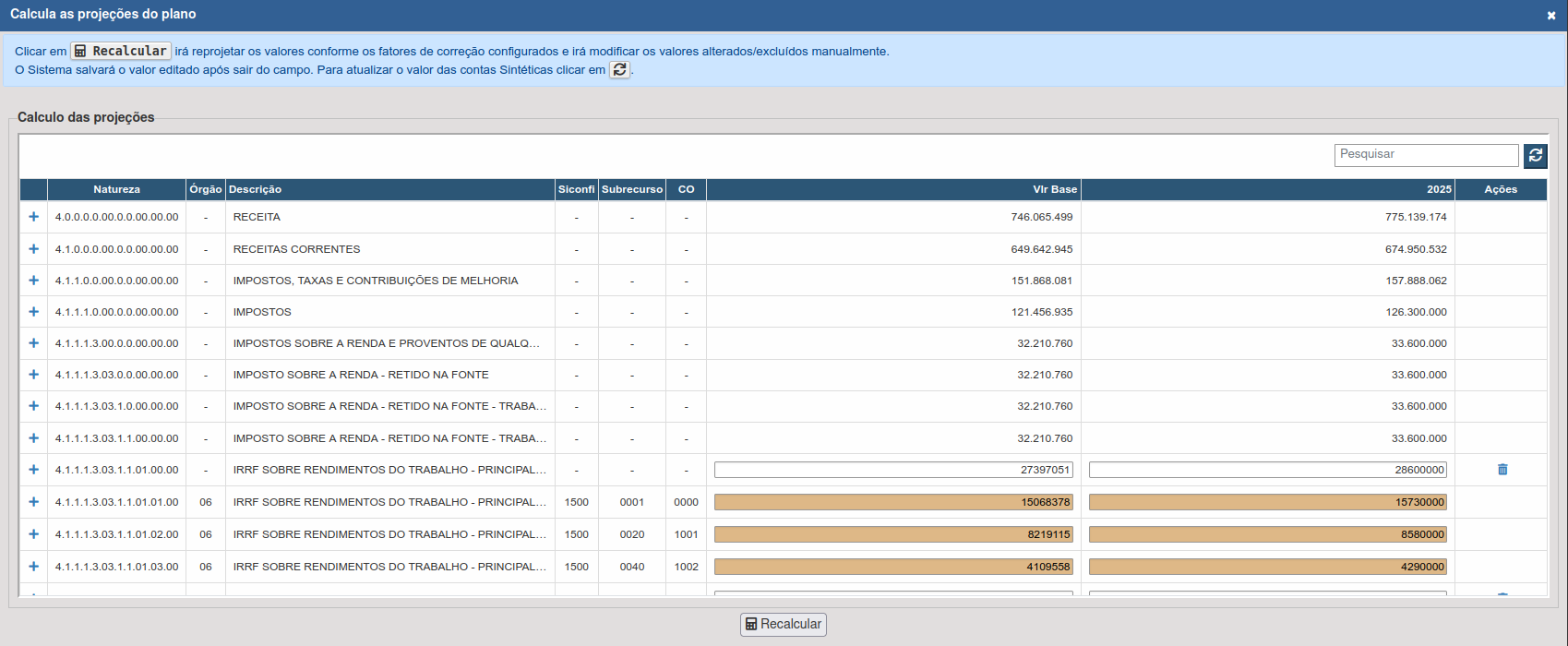 O botão Recalcular refaz o cálculo das projeções conforme a primeira vez, logo, as receitas editadas e excluídas voltarão para editar novamente.