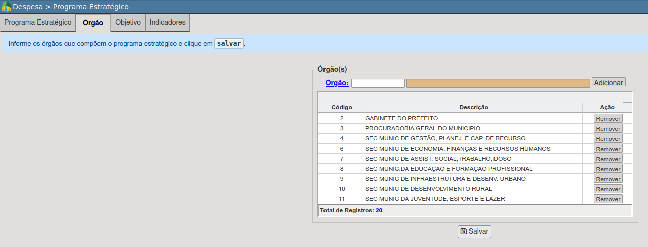 Órgão: aparecerão os órgãos informados nos programas adicionados anteriormente e pré selecionados na tela anterior;