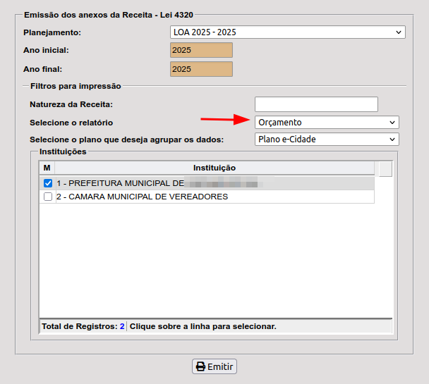 Emissão do Orçamento com layout Balancete da receita (filtro Orçamento):