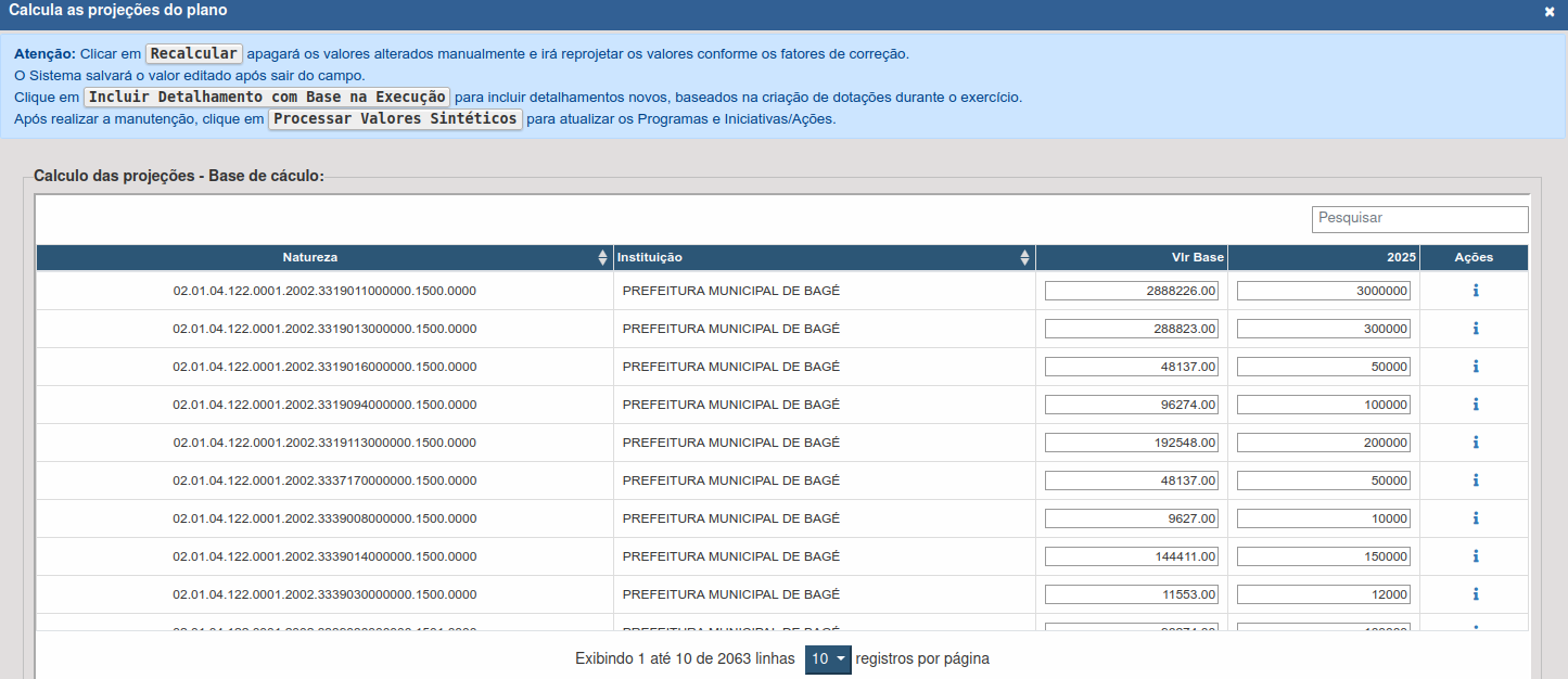 Após as projeções automáticas para os valores da LOA, caso o valor não seja o adequado, pode-se editar a coluna valor base e o sistema calcula automaticamente as projeções conforme a configuração dos inflatores/deflatores.