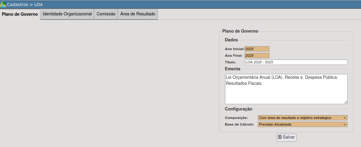 FINANCEIRO > Planejamento > Cadastros > LOA