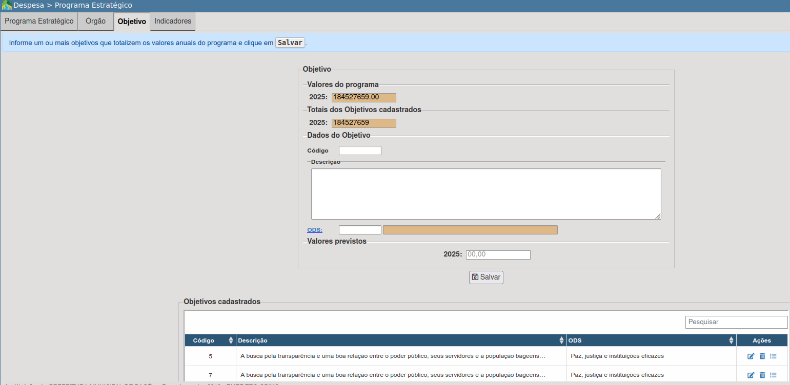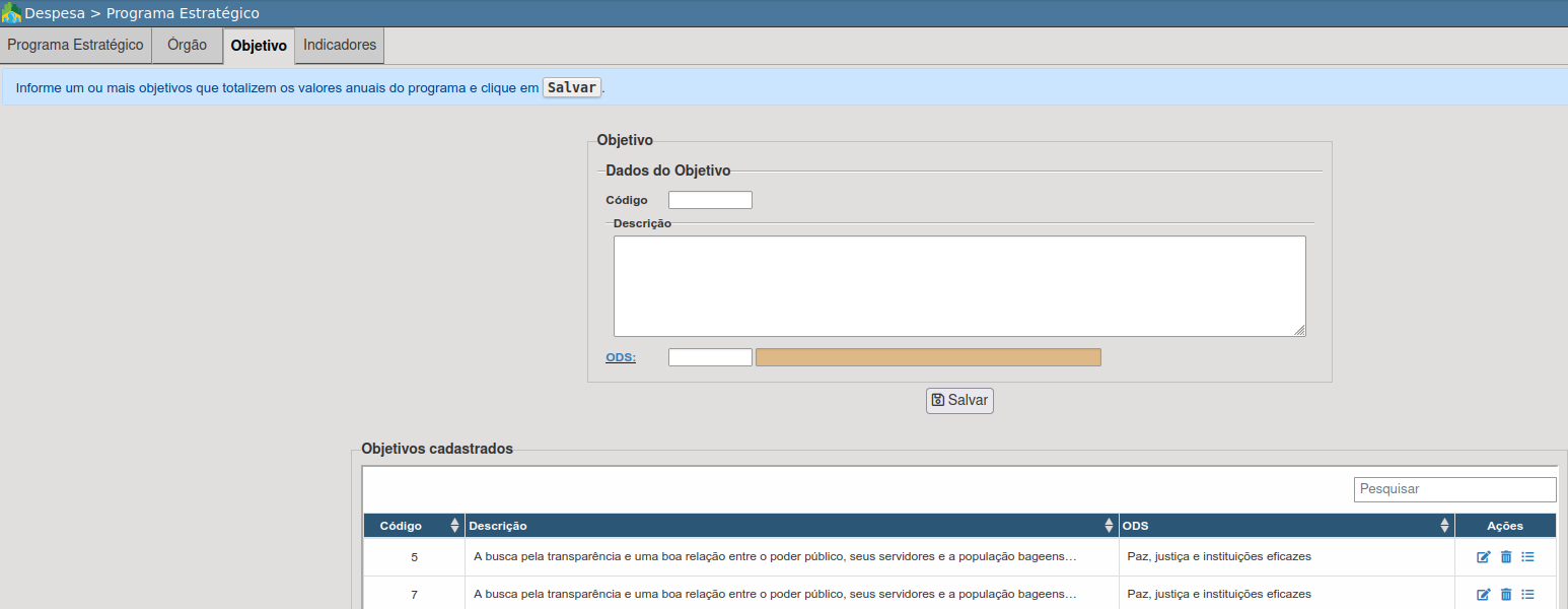 Dentro de cada Programa estratégico, são lançados seus objetivos, porém ainda não possuem vínculo com as Iniciativas que são lançadas posteriormente.