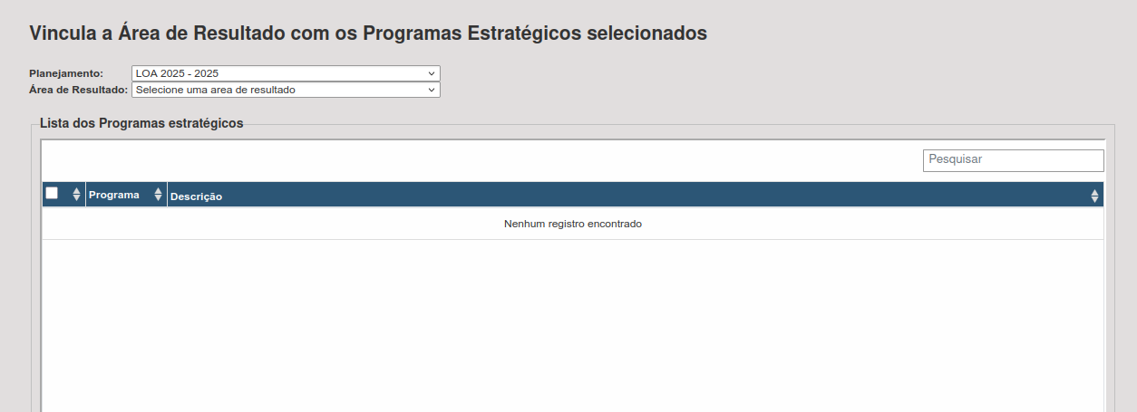 Quando se configura o Planejamento para ter Área de Resultado, não temos o vínculo do mesmo com os Programas Estratégicos.