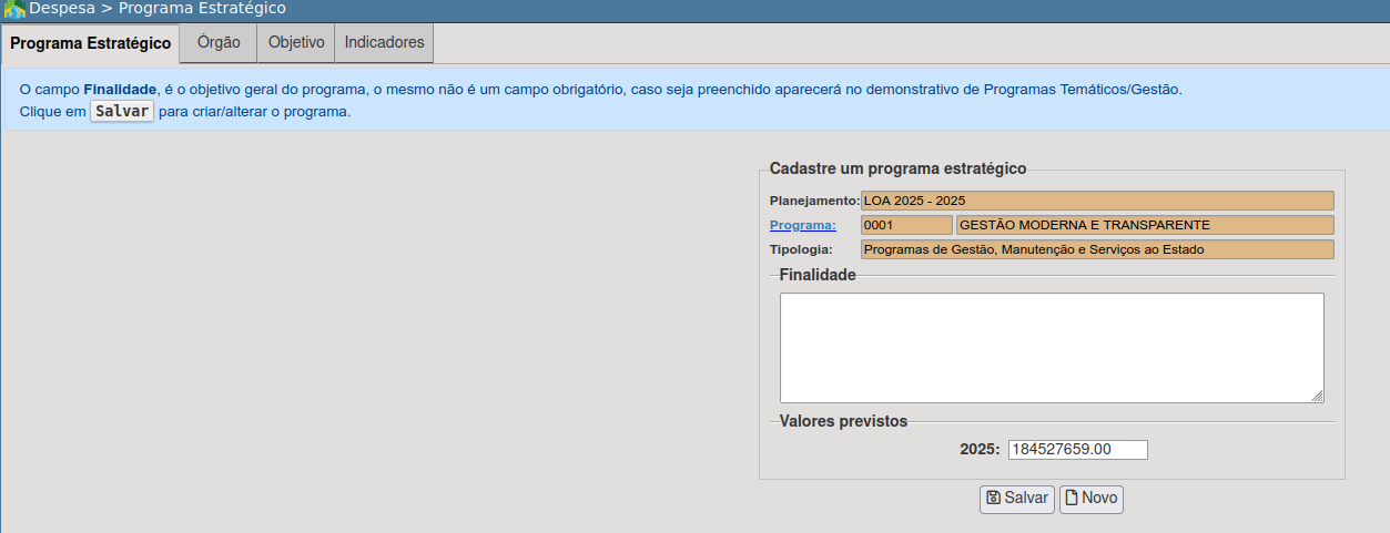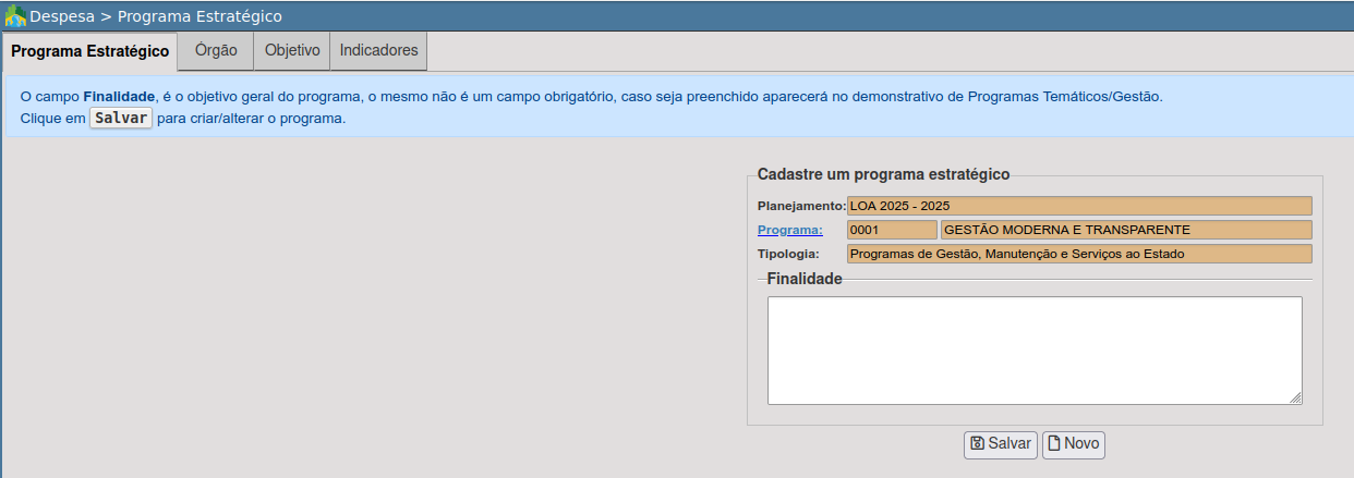Finalidade: objetivo principal do programa, o mesmo não é obrigatório, mas se preenchido, é demonstrado nos relatórios de programas;