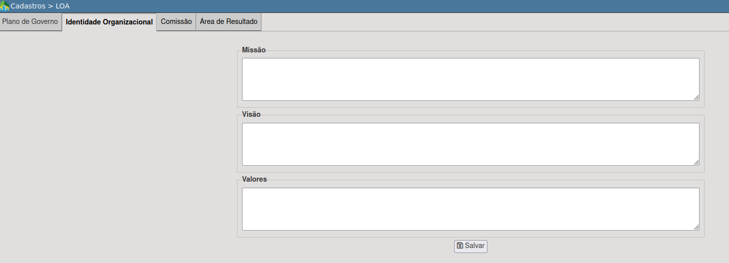 Onde nenhum campo é obrigatório. Informar a missão, visão e valores do Plano de Governo. Se foi preenchido esses dados no Plano de Governo do LDO, será mantido os mesmos textos.