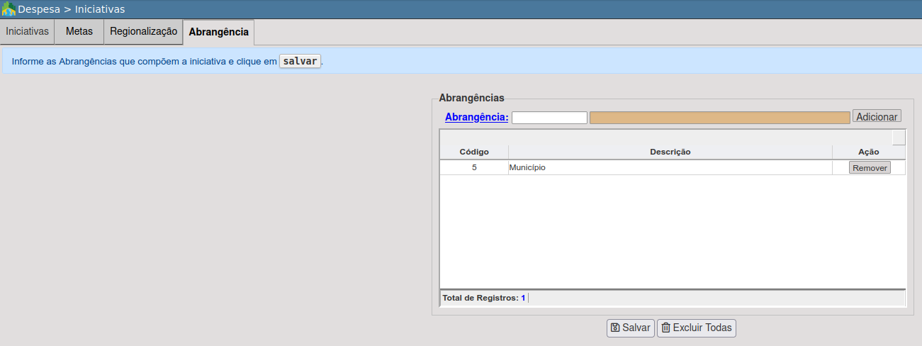 Selecionar as abrangências de cada Iniciativa, onde podem ser uma ou mais. Ao clicar na âncora, serão listadas as abrangências: Norte, Sul, Leste, Oeste e Munícipio.