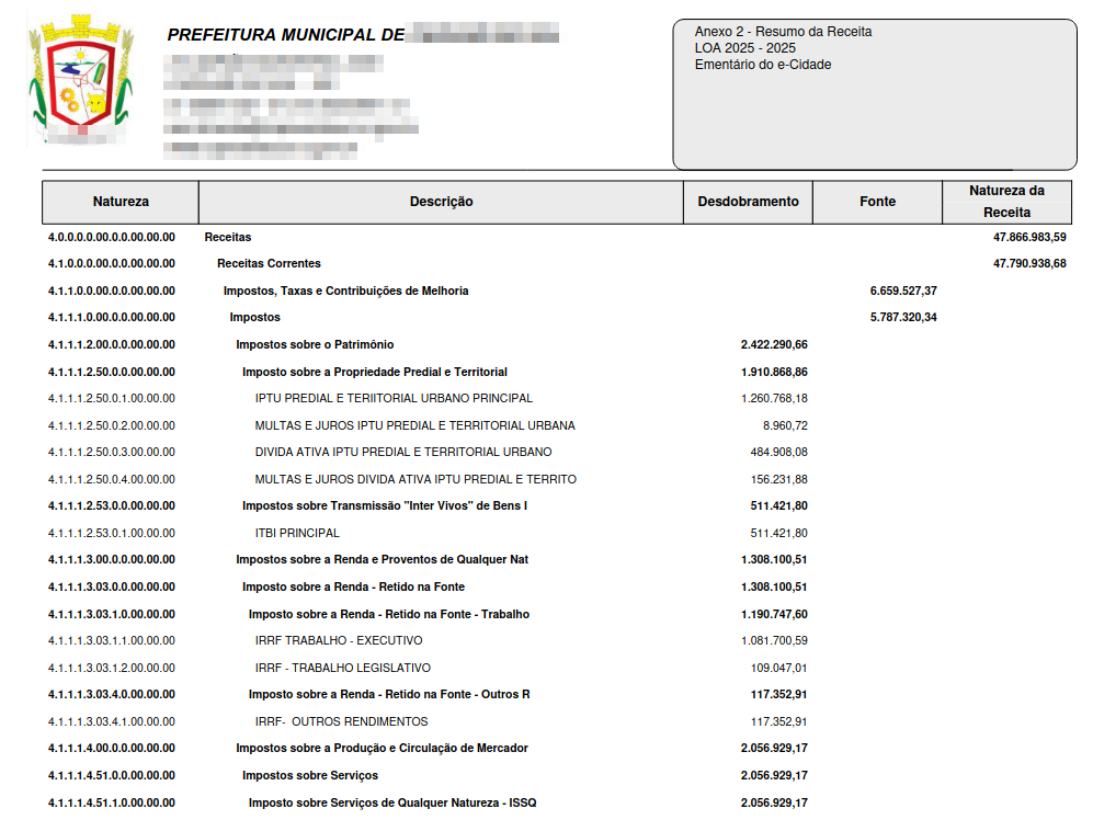 - Nos relatórios que apresentam recurso e reduzido, o estrutural poderá repetir, visto que são receitas diferentes; Mas nos relatórios que não são exibidos recurso e reduzido, o sistema agrupará as fontes de receita.