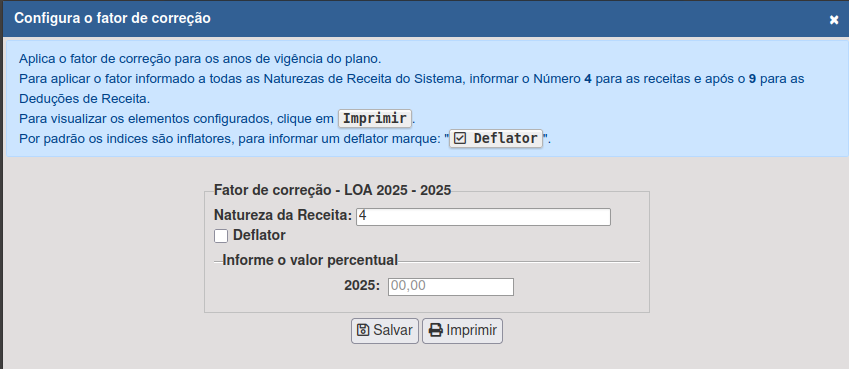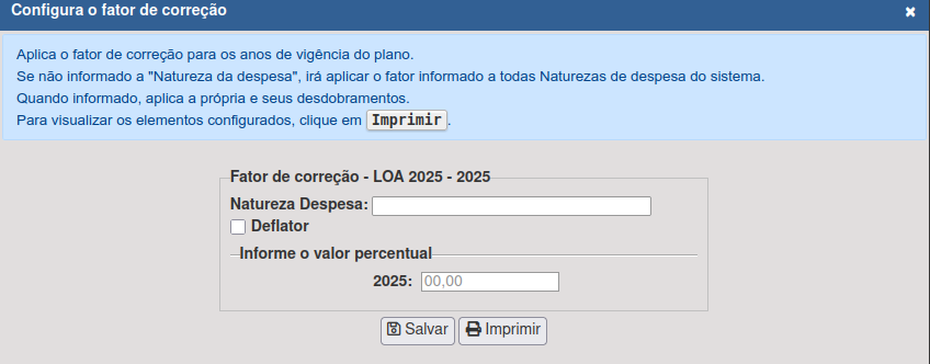 Após clicar em Fator de Correção, informar a Natureza da Despesa e o percentual de correção para o ano da LOA: