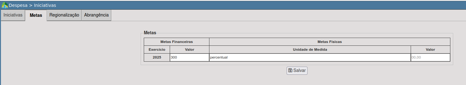 Metas Financeiras: Expressa o volume de recursos estimados para a execução de uma ação; lançar o valor das Iniciativas para o ano da LOA;