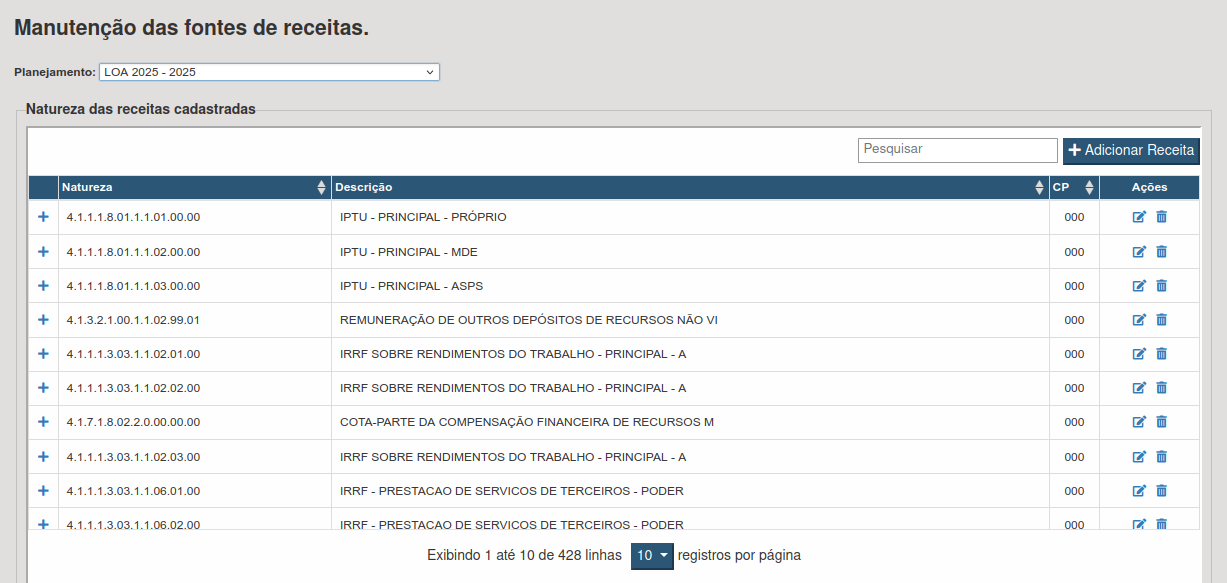 Pode-se excluir qualquer receita que não deseja ter na LOA, basta clicar na ação: