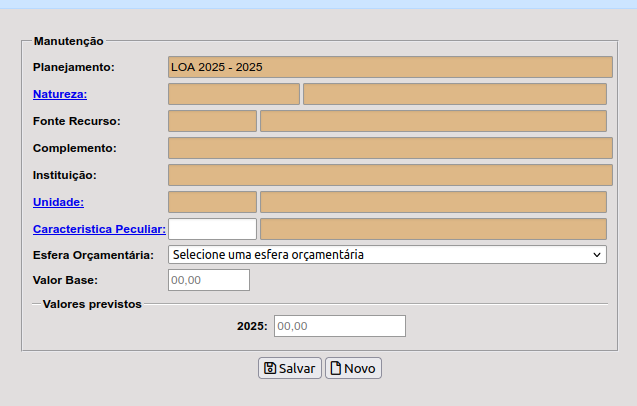 Valores Previstos: Os valores previstos serão preenchidos automaticamente conforme o valor base ou poderá ser preenchido manualmente os valores previstos para o ano da LOA.
