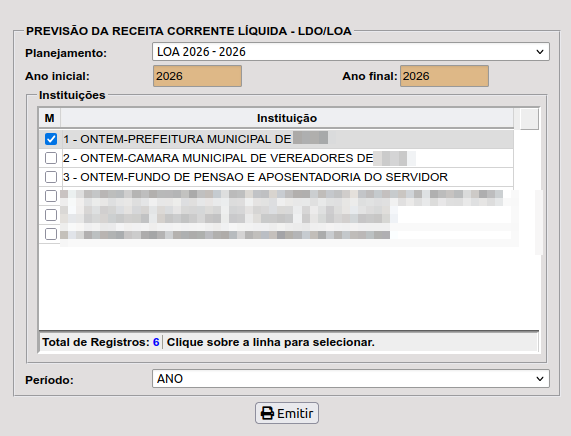 FINANCEIRO > Planejamento > Relatórios > Anexo de Metas e Riscos Fiscais > Outros Anexos > Previsão da Receita Corrente Líquida - LDO/LOA