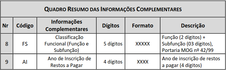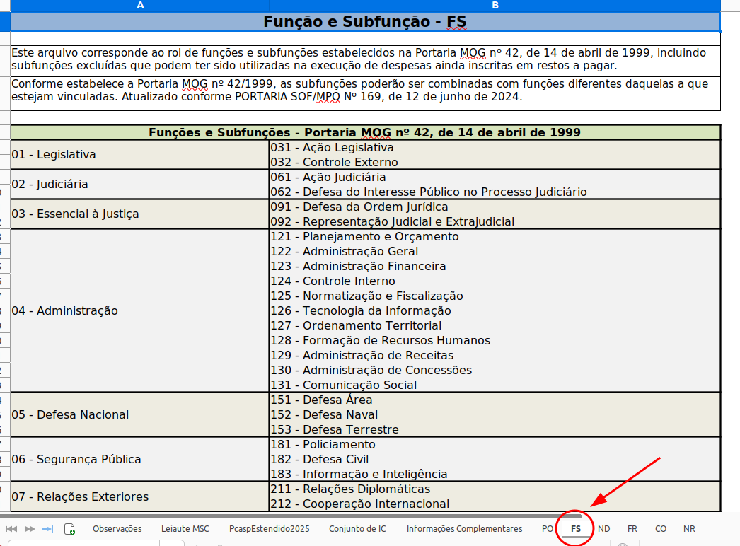 Os padrões de função + subfunção encontram-se no Anexo II da documentação da MSC: