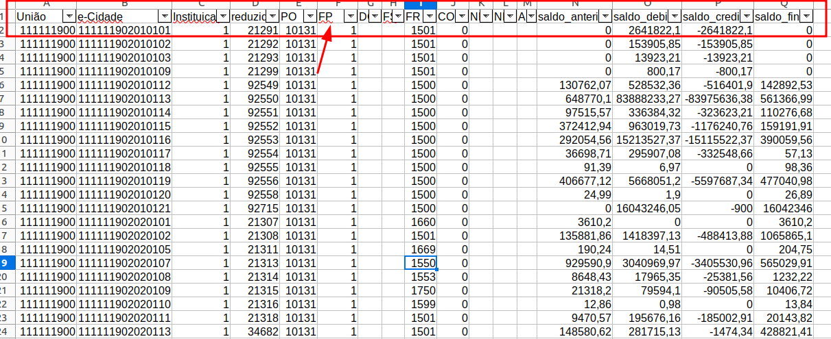 Coluna I: informação complementar FR - Fonte de Recurso, disponível em quase todas as contas contábeis;