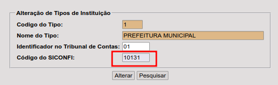 CONFIGURAÇÃO > Configuração > Cadastros > Cadastro de Tipos de Instituição > Alteração