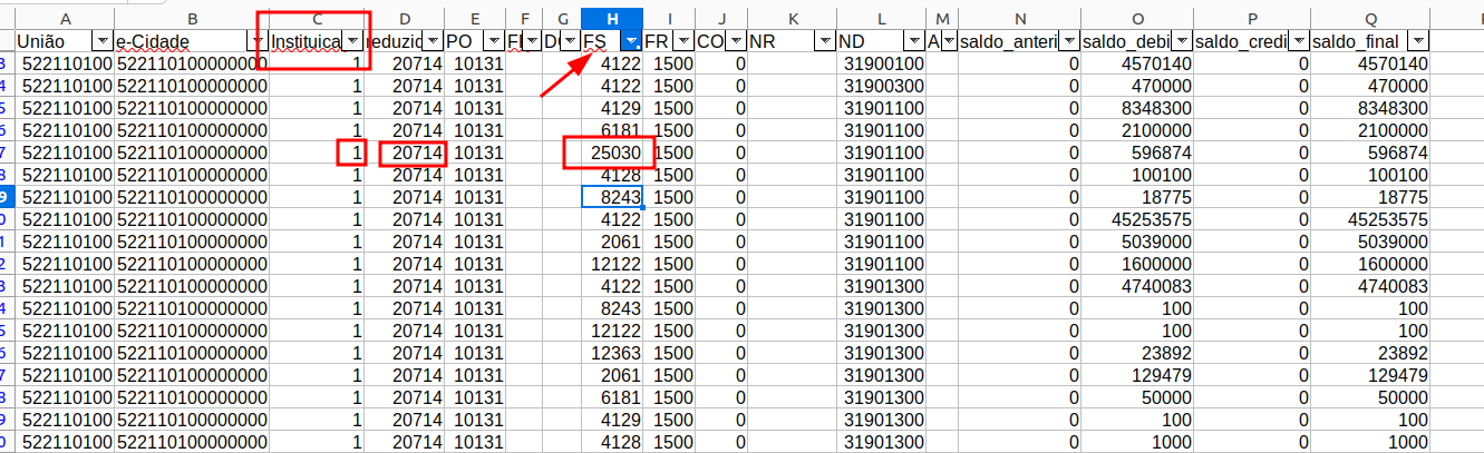 Informe o mesmo período da geração da MSC e imprima; acrescente, na primeira linha do arquivo, os filtros; selecione a coluna FS o campo que apresente a célula com o dado do erro e identifique a Instituição e o reduzido:
